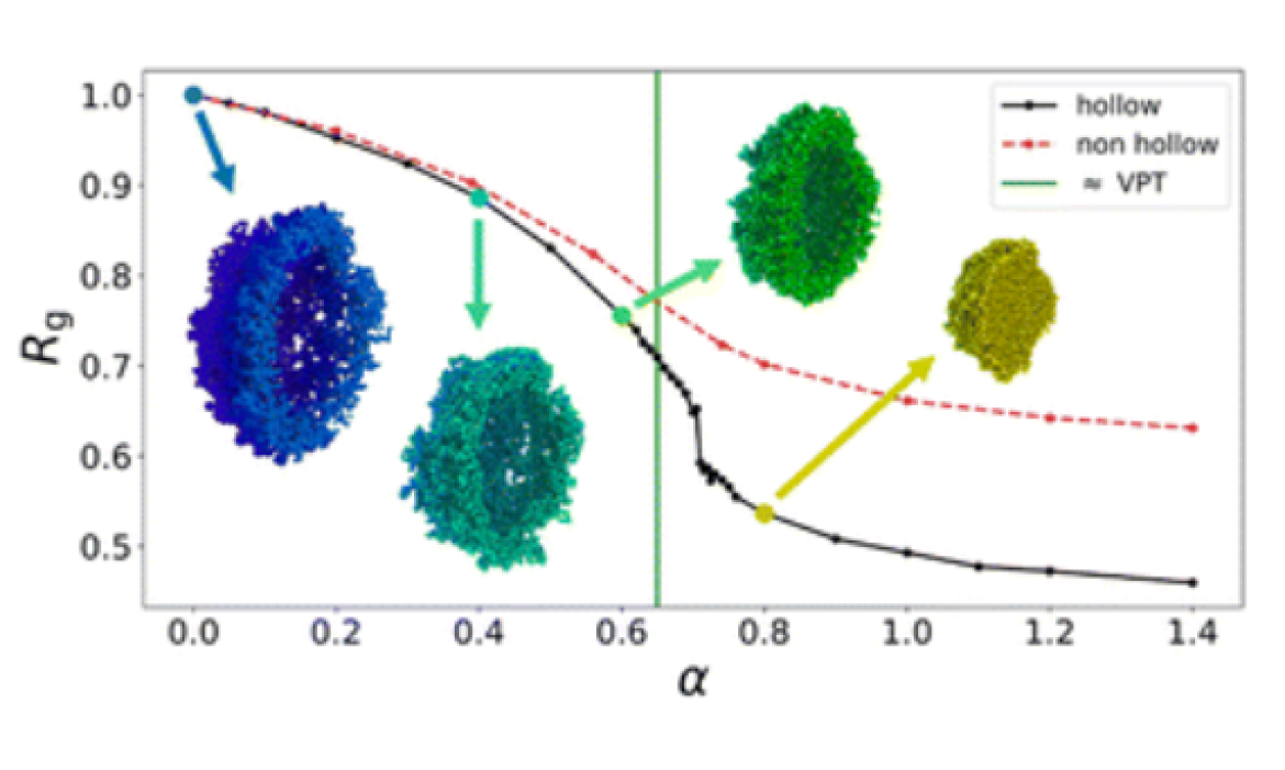 (Fig.) Radius of gyration as a function of effective temperature parameter (alpha) for hollow and non-hollow microgels. The Volume Phase Transition (VPT) is indicated by the green line.